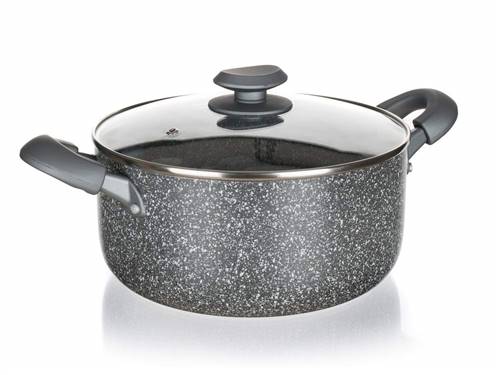 Hrnec s nepřilnavým povrchem GRANITE PR 20 x 9,5 cm, se skleněnou poklicíHliníkový presovaný kastrol GRANITE 20 x 9 cm s nepřilnavým 2vrstvým povrchem v granitovém dekoru, šedou bakelitovou rukojetí se soft-touch povrchovou úpravou a plně indukčním dnem.