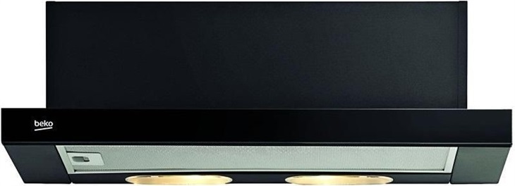 výsuvný, max. výkon 420 m3/hod., posuvné ovládání, hlučnost 57-69 dB, 3 rychlosti, halogenové osvětlení 2x 28 W, 2 omývatelné hlinílové tukové filtry, odtah/recirkulace, šířka 60 cm, černý