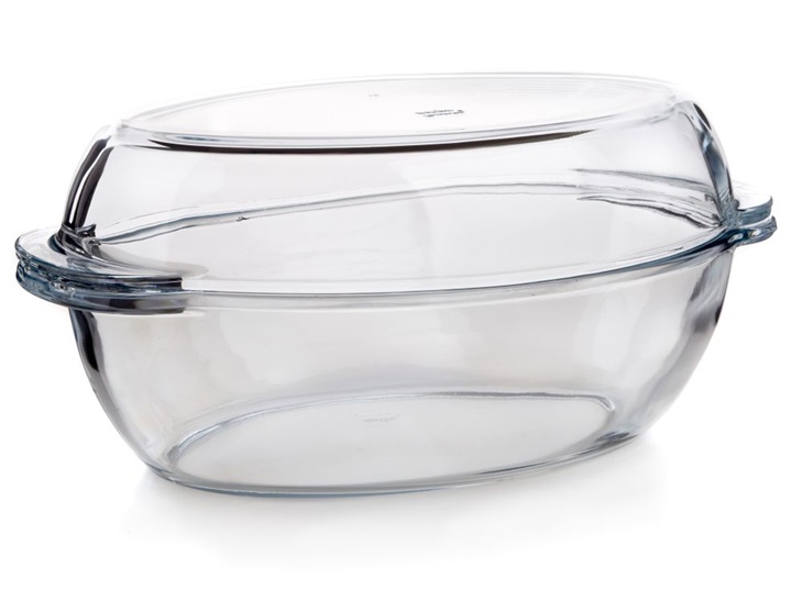 Pekáč skleněný oválný s víkem 4,15 lOválný pekáč s víkem 4,15 l z varného skla, délka 34 cm, šířka 19,6 cm, výška 14,4 cm. Pekáč je vyroben z tvrdého boritokřemičitého skla, které je velmi odolné, jak mechanicky, tak i teplotně (teplotní rozsah -50 až / 500 st. C). Výhodou je dlouhá životnost, hygienická nezávadnost (sklo je hladké a neporézní), snadná údržba (lze mýt v myčkách na nádobí), sklo je ekologický materiál.