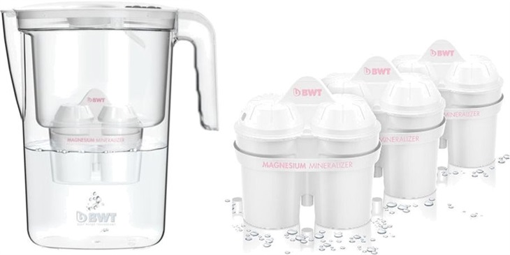 filtrační konvice BWT VIDA o objemu 2.6 litru s mechanickým ukazatelem výměny filtru, snadné plnění vodou, díky automatickému plnícímu víčku (Easy Fill), vejde se do dveří všech běžných chladniček (Easy Fit), balení obsahuje tři filtry