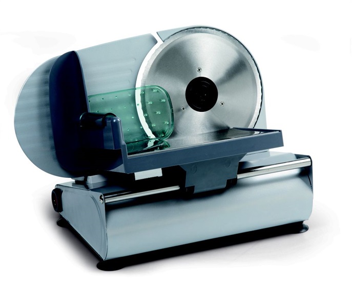 lehce ozubený, vyměnitelný nůž z ušlechtilé oceli (19 cm), krájení s držením tlačítko, nebo nepřetržité s tlačítkem v aretované pozici, nastavitelná tloušťka krájení od 1 do 15 mm, celokovový, velmi snadné čištění, příkon 150 W