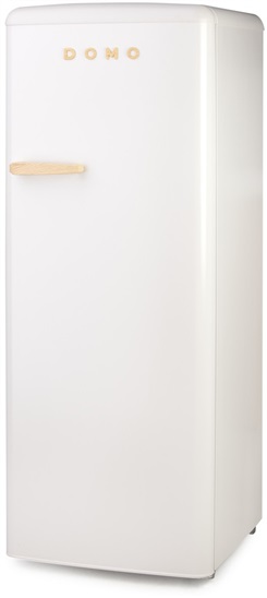 Mléčně bílá retro lednice s objemem 225 l*. Velké madlo v dekoru dřeva. Velmi úsporná energetická třída D se spotřebou 81 kWh / rok. Tichý provoz 39 dB. Vnitřní LED osvětlení.