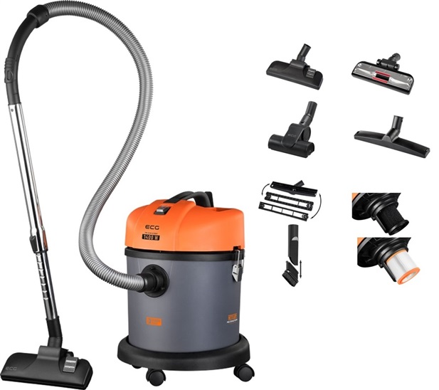 příkon 1400 W, kombinace 2v1 - suché a mokré vysávání nádoba na prach a vodu o objemu 20 l, akční rádius 9 m (kabel 6m); kovová teleskopická trubice, HEPA filtr F9, podlahový kartáč, TURBO kartáč, parketová hubice, hlučnost 78±2 dB, BEZSÁČKOVÝ!!!