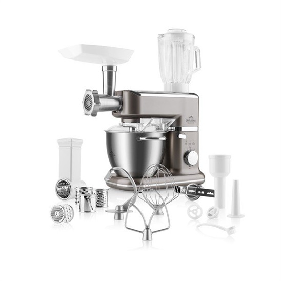 800 W, kovová převodová kola, objem mísy 4,5l, objem mixéru: 1,4l, funkce: hnětení, krájení, krouhání, šlehání, mísení, mixování, strouhání, mletí masa, plnění uzenin, tvorba Kebbe, světelná signalizace provozu, barva: šedá.