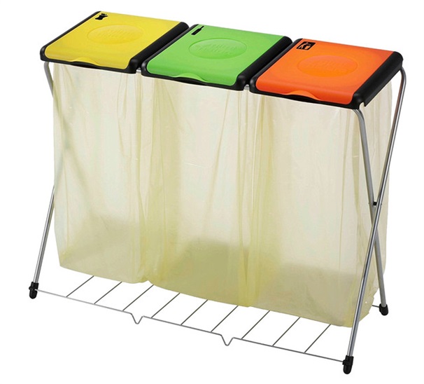 Stojan na odpadkové pytle v praktickém a univerzálním designu. Konstrukce: ocel. Poklop: 100% pryskyřice. Symboly třídění odpadu. Vhodný pro všechny druhy pytlů s kapacitou do 130 l. Je odolný slunečnímu záření. Dvojitý okraj na lepší zajištění pytle prot