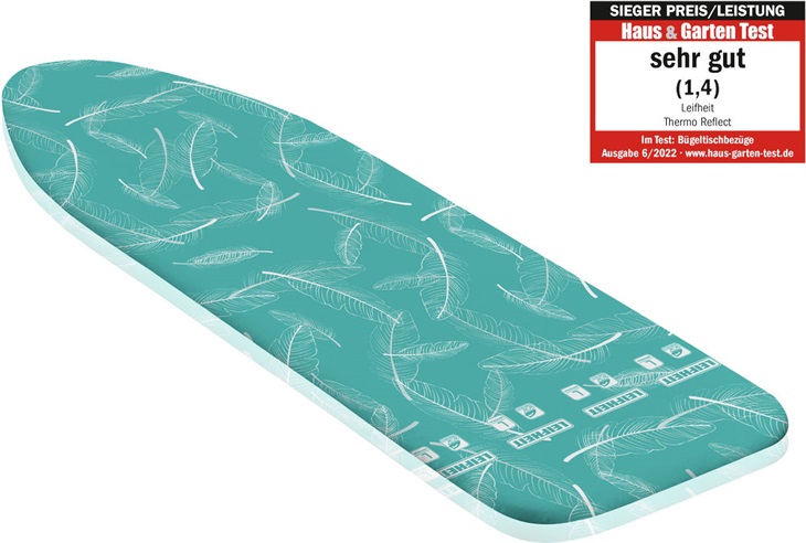 potah s titanovým povlakem, který odráží páru a teplo a tím zajišťuje o 33% rychlejší žehlení, 4 mm molitanové polstrování, vhodné pro žehlicí prkna Air Board, stahování šňůrkou s klipsem, průžný potah pro snadnější aplikaci na žehlicí desku, rozměry až 140 x 45 cm