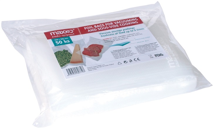 Náhradní sáčky k vakuové baličce potravin Maxxo, v balení 50 kusů vakuovacích sáčků vyrobených z odolné fólie se silným drážkováním pro pevný a trvalý svár, rozměry 22 × 28 cm,lze umýt a použít opakovaně, vhodné pro vaření metodou Sous Vide