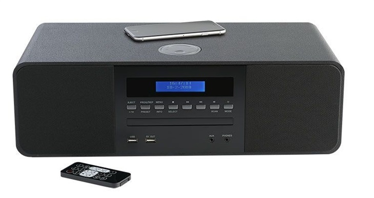 Mikrosystém černý s bluetooth s indukčním nabíjením, FM rádio s RDS přehrává CD-R/RW/MP3, výkon 50 W, ekvalizér, USB vstup pro přehrávání a USB port pro nabíjení, dálkové ovládání, napájení ze sítě 230V.